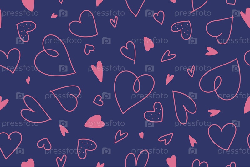 Бесшовный узор из рисованных иконок сердца. Розовые сердца в стиле каракули на синем фоне. Дизайн для поздравительных открыток, принтов, упаковки. Вектор
