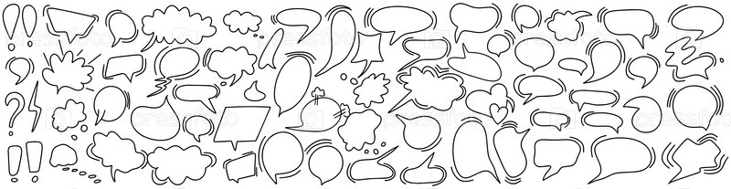 Большой модный набор диалоговых окон, разные варианты нарисованы вручную. Коллекция речевых пузырей для разговора, диалога, оформление в стиле каракули на сером фоне. Пустые комиксы