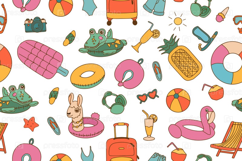 Нарисованный вручную бесшовный узор из элементов летнего отдыха и путешествий. Стиль эскиза в стиле дудлов. Иллюстрация для обоев, фона, упаковки, открыток, полиграфии. Векторная иллюстрация