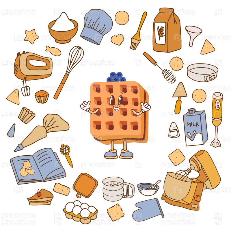 Красочные модные аксессуары для выпечки. Набор кухонных принадлежностей для приготовления пищи в стиле каракули на белом фоне. Вектор
