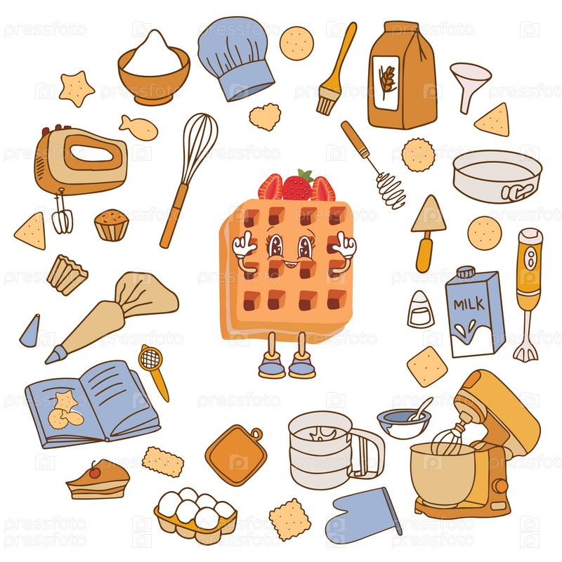 Рисованные вручную эскизы иконок на кулинарную тему - кухонная утварь, выпечка. Модный баннер для оформления меню, кулинарных книг и упаковки. Векторная иллюстрация