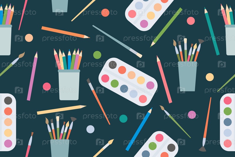 Бесшовный узор из художественных принадлежностей. Красочный принт для международного дня художника, школьные принадлежности, Назад в школу, тема художественной школы