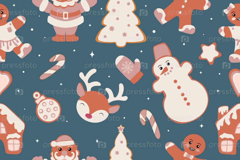 Зимний бесшовный узор с рождественскими фигурками, пряничным печеньем. Потрясающий праздничный фон. Рождественская повторяющаяся текстура для дизайна поверхности, обоев, ткани, упаковочной бумаги и т. д