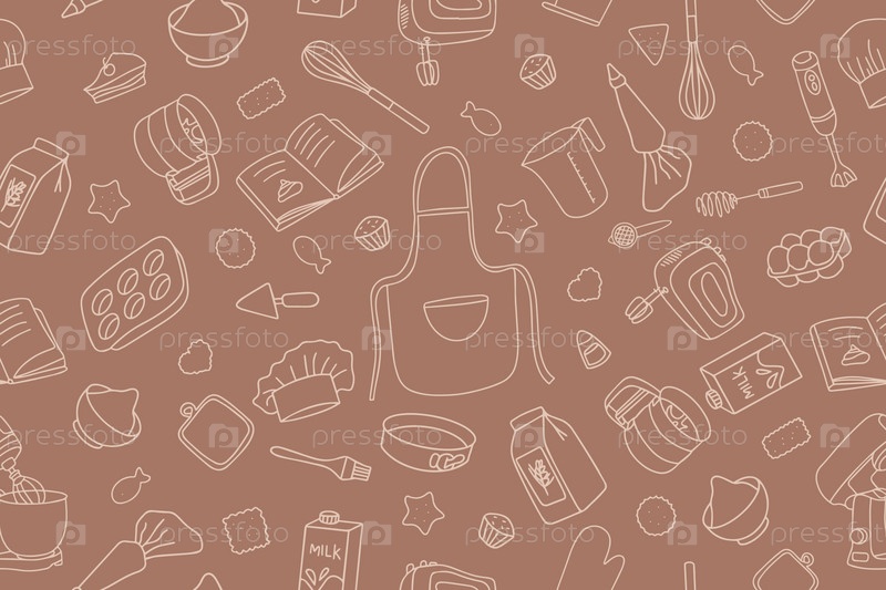 Модный бесшовный узор аксессуаров для кондитера, повара. принадлежности для выпечки. набор кухонных принадлежностей для приготовления пищи в стиле doodle на фоне цвета 2025 Mocha Mousse. вектор