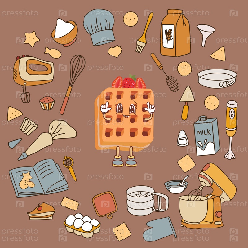 Ручно нарисованные эскизы икон на кулинарную тематику - кухонная утварь, выпечка. Модный баннер для оформления меню, кулинарных книг и упаковки. Цвет фона 2025 Mocha Mouss