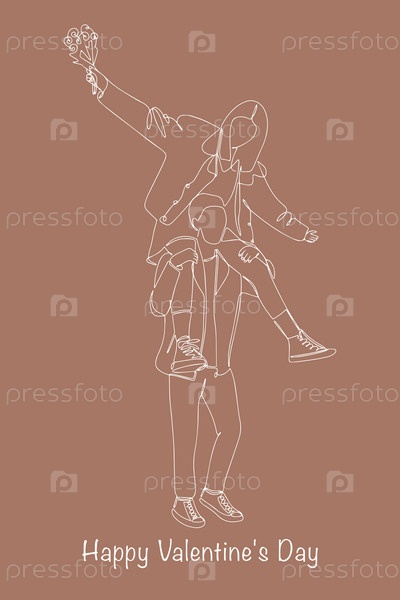 Сплошной однолинейный рисунок счастливой смешной молодой пары. Счастливая, романтическая пара. Молодой мужчина и женщина в любви. Валентинка на День святого Валентина. Векторная иллюстрация, нарисованная вручную на фоне мокко-мусса