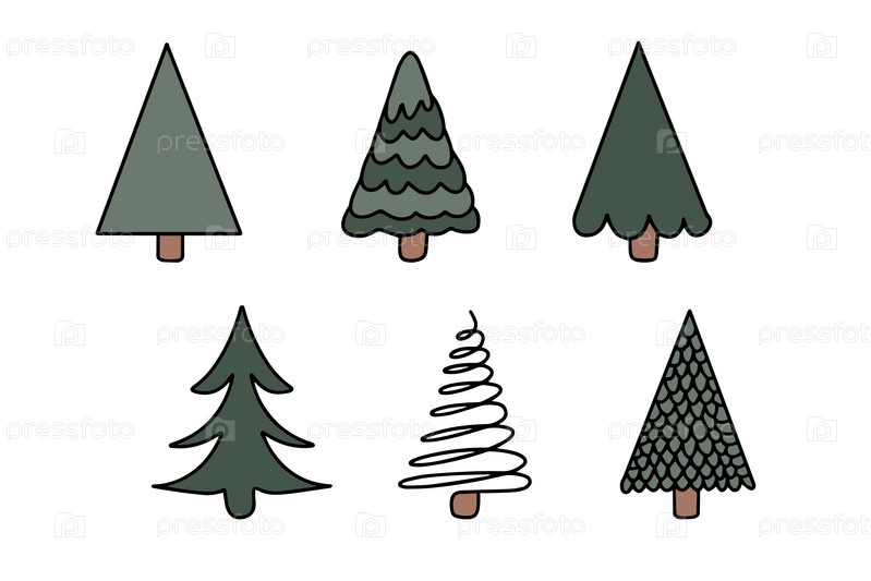 Набор нарисованных вручную линейных рождественских елок. Современные рождественские елки в стиле дудл. Идеально подходит для праздничных поздравительных открыток, упаковки, декора. Вектор
