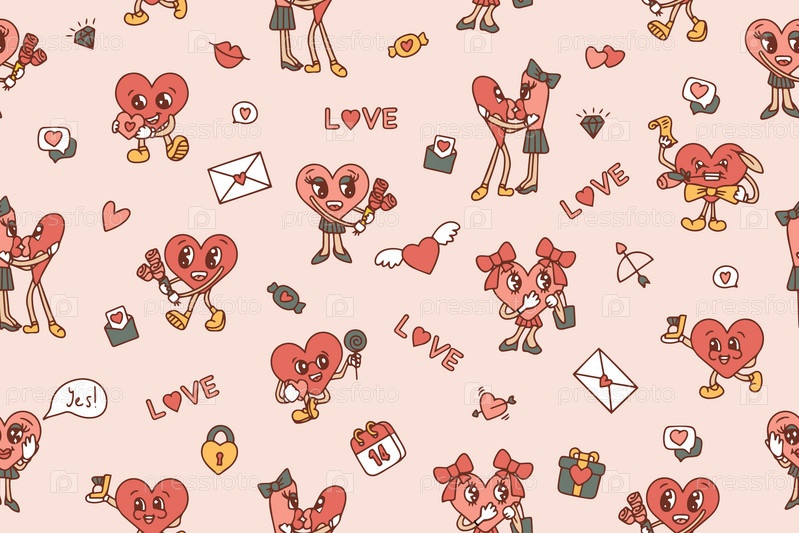 Забавный узор и текстура в модном ретро-стиле 60-х 70-х годов. Векторный бесшовный узор в розовых и красных тонах ко Дню святого Валентина
