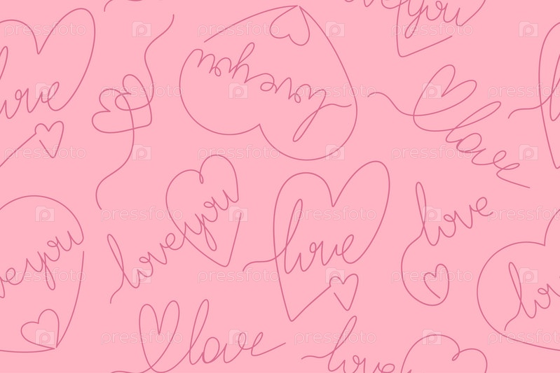 Бесшовный узор из сердец и любовных надписей на розовом фоне. День святого Валентина, день свадьбы. Фон для дизайна открыток, принтов и плакатов