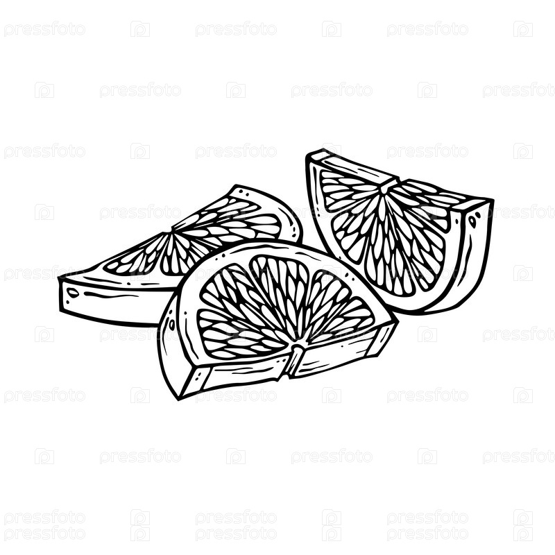 Ломтики лимона. Ломтики лимона. Нарисованная от рук иллюстрация цитрусовых. Линейный рисунок долек лайма. Контурный набросок цитрона. Черная контур нарезанного грейпфрута для кухонного текстиля, упаковка, этикетки. Ломтики лимона. Ручная графическая иллюс