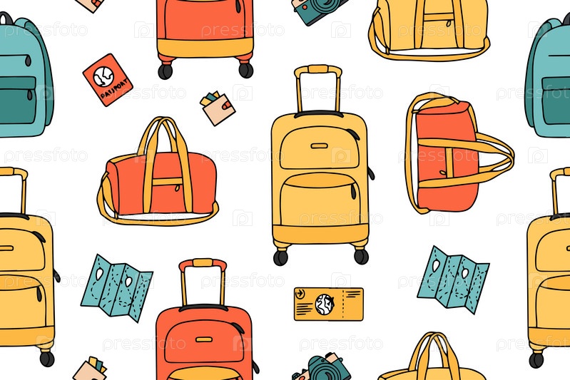 Красочные бесшовные модели аксессуаров для отдыха и путешествий. Чемодан, дорожная сумка, рюкзак, паспорт, билет, карта, камера в стиле каракули. Белый фон. Вектор