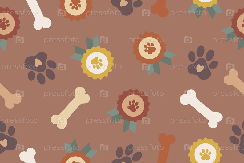 Бесшовный узор с отпечатками лап, медалями и костью для собаки-чемпиона. Приз победителя конкурса домашних животных среди собак и щенков. Вектор, изолированный на фоне мокко-мусса. Векторная иллюстрация