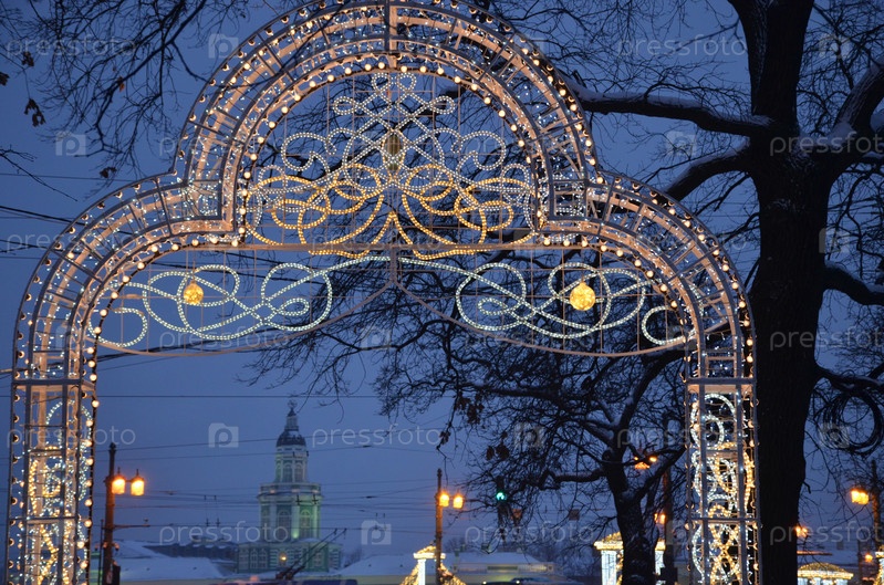 Вид на Кунсткамеру сквозь новогоднюю световую арку в Саду Зимнего Дворца у музея Эрмитаж в Санкт-Петербурге