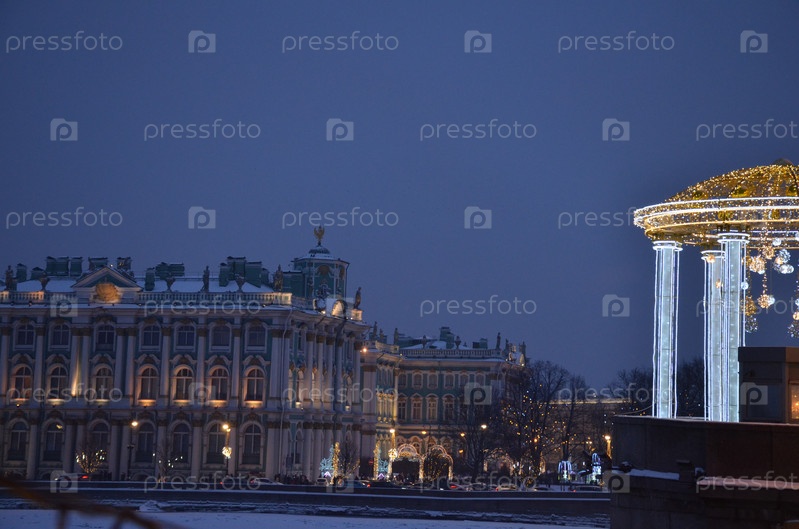 Новогоднее украшение Дворцового моста в Санкт-Петербурге, вида на Дворцовую набережную и Зимний дворец (Эрмитаж)