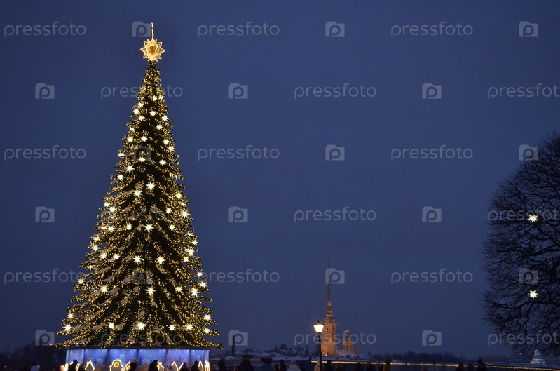 Новогодняя ель в Биржевом сквере на стрелке Васильевского острова в Санкт-Петербурге, на заднем фоне Петропавловский собор