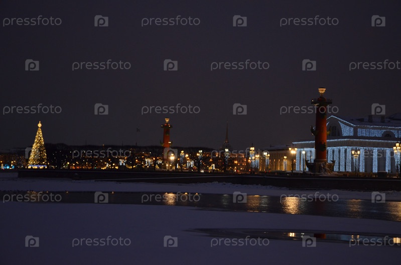 Стрелка Васильевского острова украшенная к Новому году: Новогодняя ель, Ростральные колонны, здание Биржи