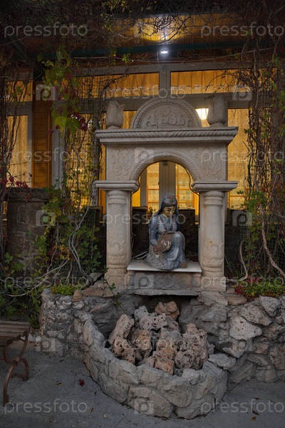 Россия, Республика Крым. Октябрь 02, 2024. Архитектура миниатюрного фонтанчика с фигурой девушки в национальной одежде с кувшином в руках, расположенного возле придорожного кафе недалеко от города Судак