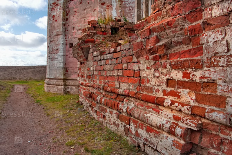 Россия, Устье. Октябрь 06, 2018. Кирпичная кладка разваленного Спасо-Каменного собора на Каменном острове Кубенского озера, взорванного в 1930 году