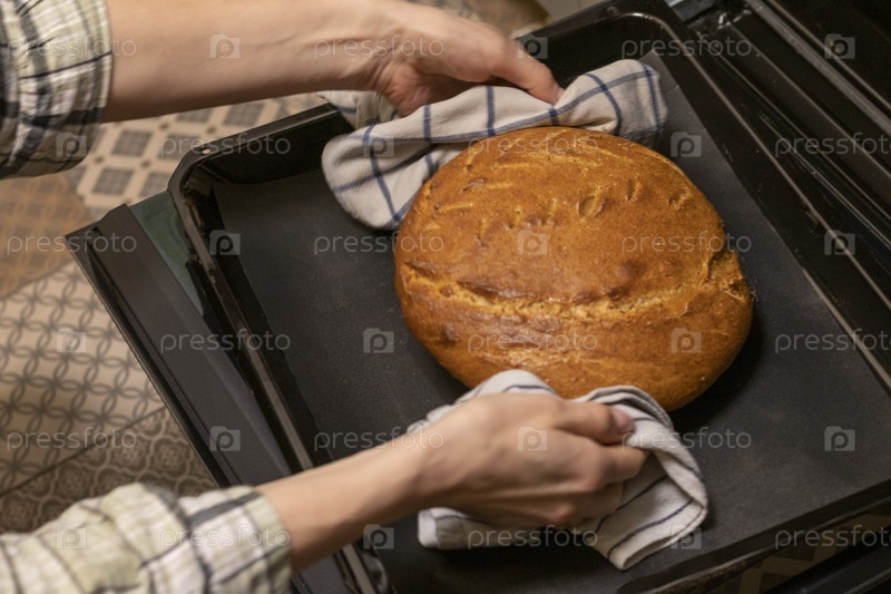 Женщина достает из печи на подносе с льняной тканью свежеиспеченную буханку ржаного хлеба. Еда