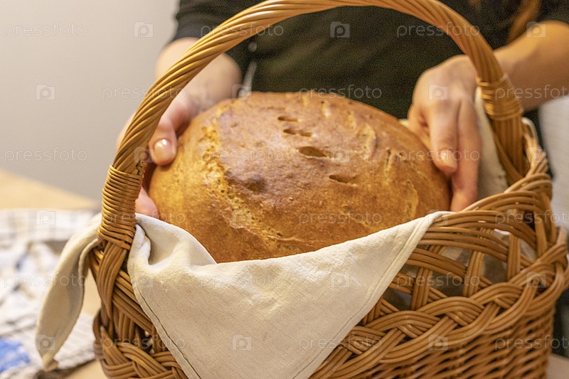 Снимок свежеиспеченной буханки домашнего ржаного хлеба на льняной салфетке в плетеной корзине. Еда
