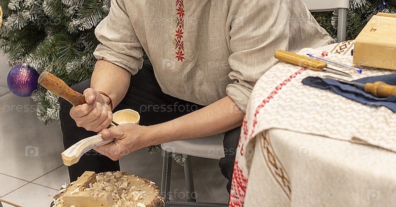 Мужчина в традиционном белорусском костюме делает сувениры плетением из бересты. Путешествия