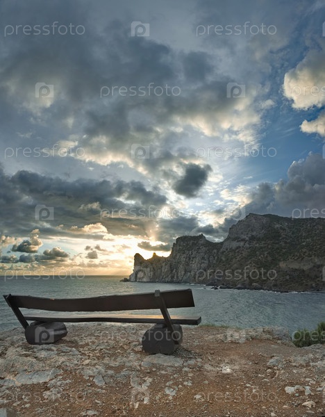 Россия. Республика Крым. Удачное место для любованием морским закатом на мысе Капчик, на котором специально для этого установлены деревянные скамейки