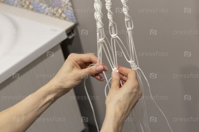 Женщина плетет макраме цветочный горшок. Хобби