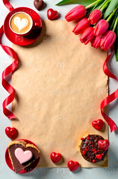 Романтическая композиция с чистой фактурной бумагой для меню кафе, кондитерской, ресторана или поздравления с Днем святого Валентина с красными тюльпанами, кофе и пирожными