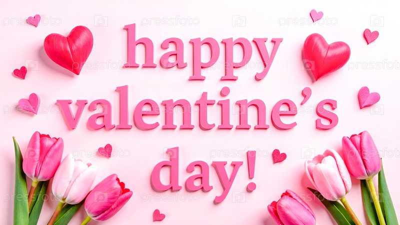 Знак "С Днем святого Валентина" в окружении сердец и тюльпанов. Плакат, баннер