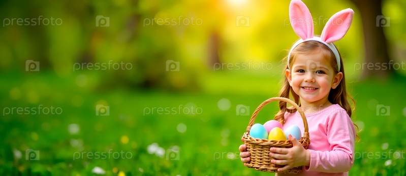 Милая маленькая девочка в повязке на голове с ушками кролика держит корзину пасхальных яиц на фоне весенней зелени. Баннер с местом для текста