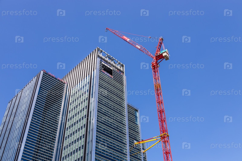 Красный строительный кран возвышается рядом с современным небоскребом под ярким голубым небом