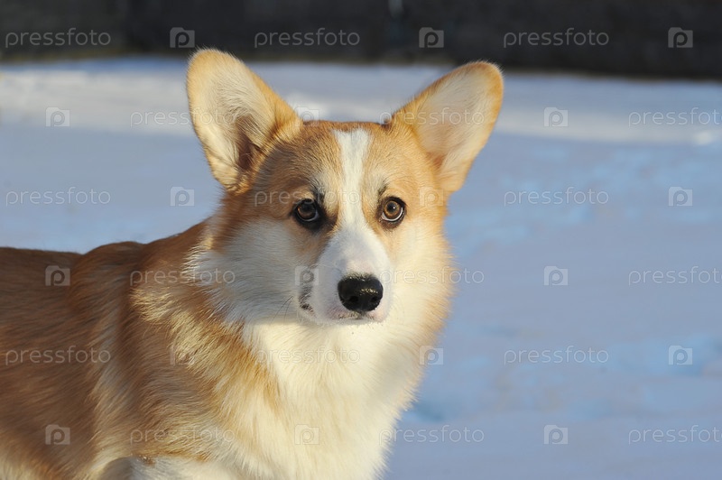 Молодая собака породы вельш-корги лежит в снегу