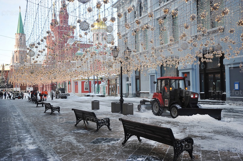 Уборка снега на Никольской улице в Москве