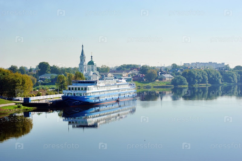 Круизный лайнер на набережной реки Волги в Твери