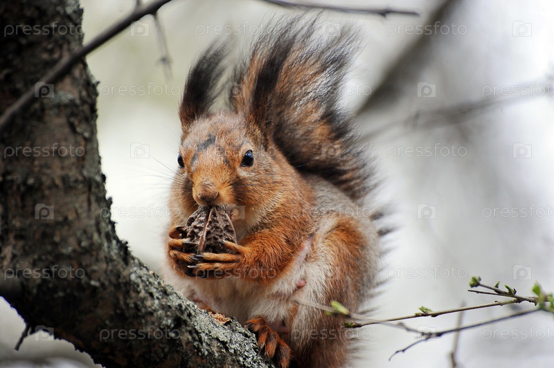 Белка сидит на дереве и ест орех