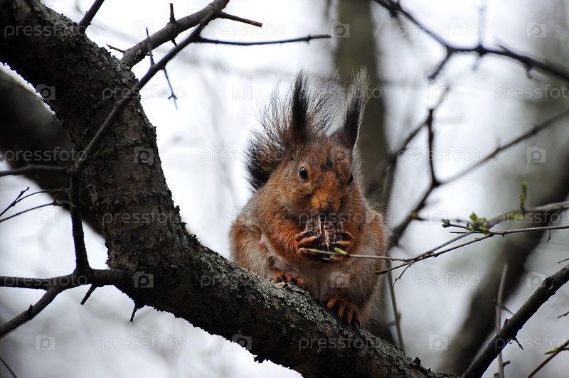 Белка на дереве с орехом в парке Царицыно
