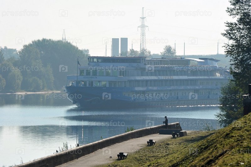 Речной теплоход плывет по Волге в Твери
