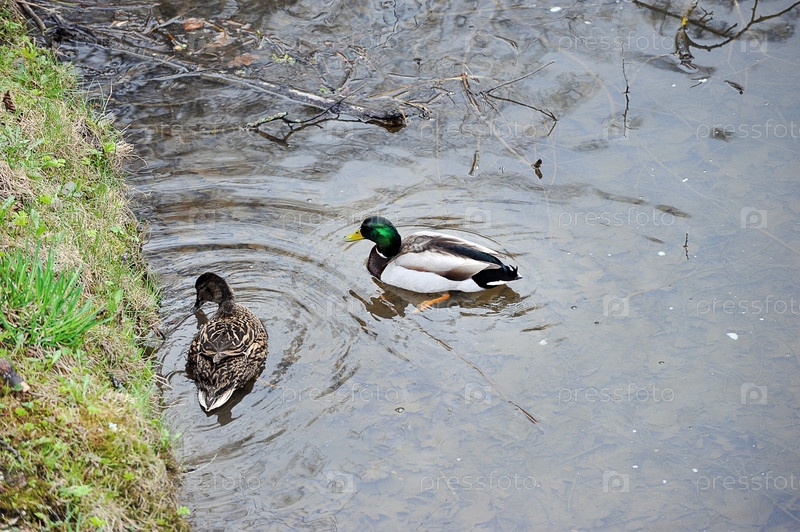 Пара уток в пруду - кряква самец и самка