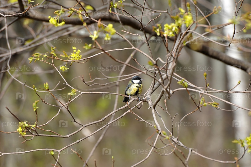 Маленькая птичка - синица после дождя в ветвях