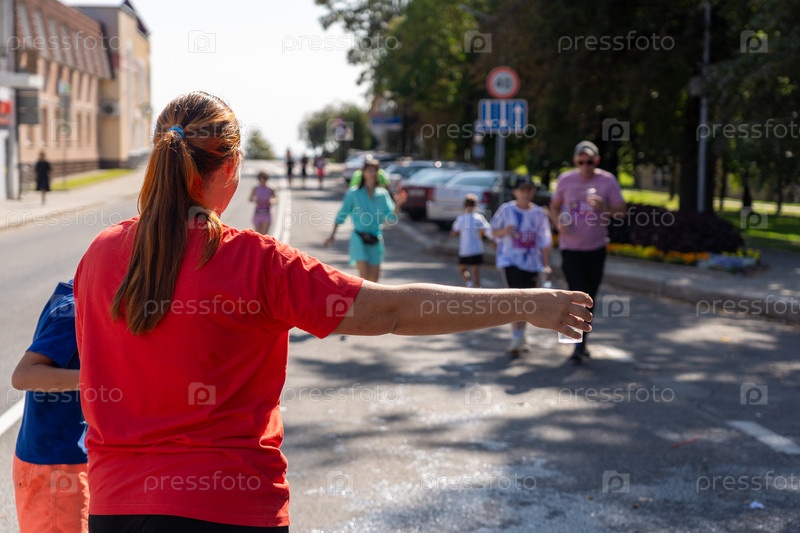 Волонтер в красной футболке протягивает пластиковый стакан с водой марафонцу. Изображение передает дух поддержки и общности на спортивном мероприятии, подчеркивая выносливость и командную работу