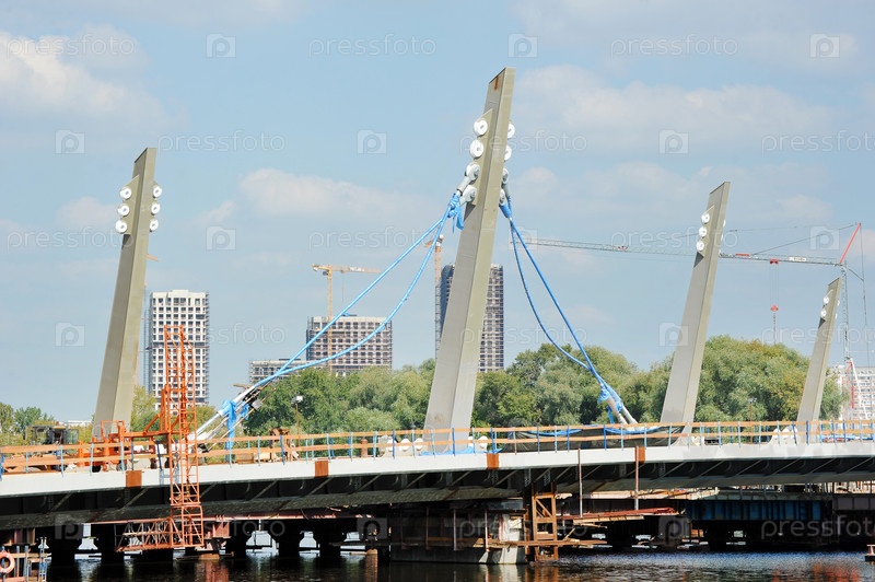 Строительство пешеходного вантового моста в Нагатинском затоне в Москве