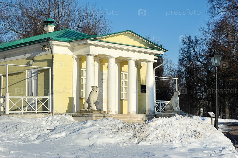Вид на историческое здание со львами в Коломенском парке в Москве