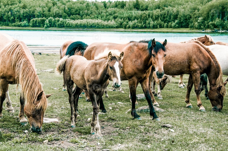 Табун лошадей свободно пасется на улице, лошадь пьет воду из реки