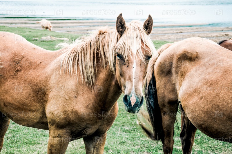 Табун лошадей свободно пасется снаружи, лошадь пьет воду из реки