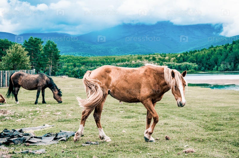 Табун лошадей свободно пасется снаружи, лошадь пьет воду из реки