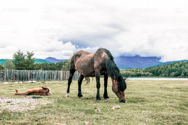 Табун лошадей свободно пасется снаружи, лошадь пьет воду из реки
