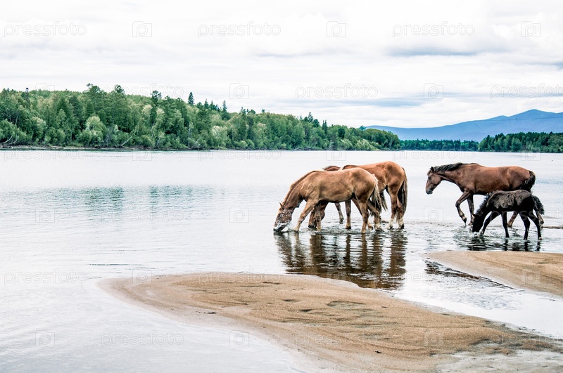 Табун лошадей свободно пасется снаружи, лошадь пьет воду из реки