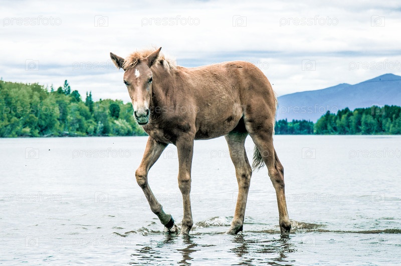 Табун лошадей свободно пасется снаружи, лошадь пьет воду из реки