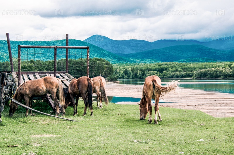 Табун лошадей свободно пасется снаружи, лошадь пьет воду из реки