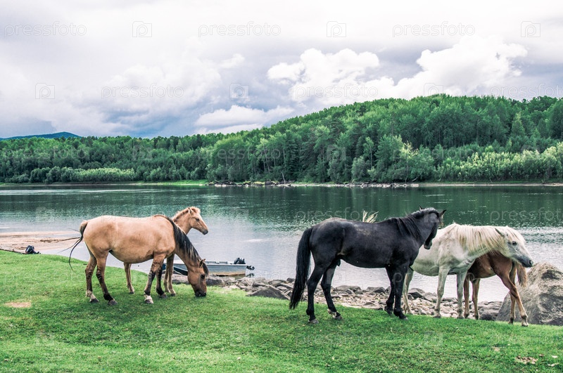 Табун лошадей свободно пасется снаружи, лошадь пьет воду из реки